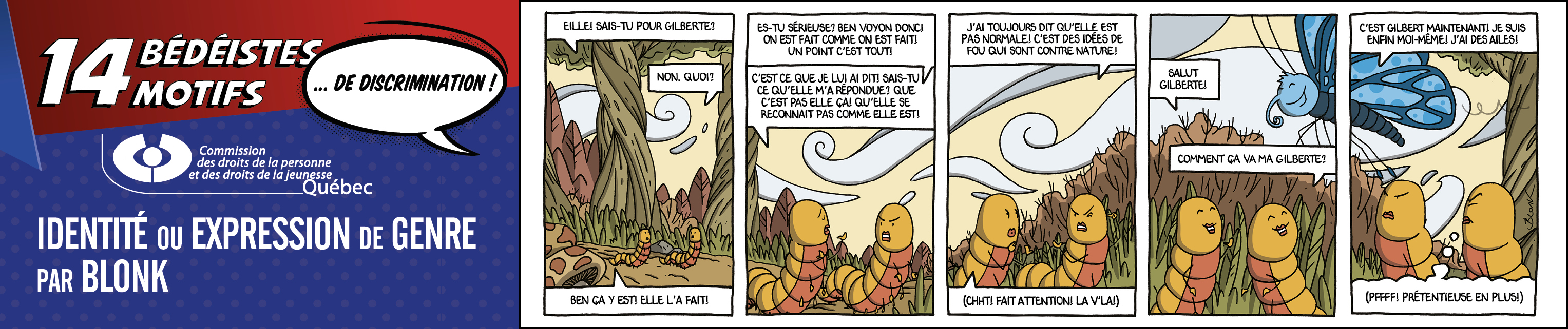 Le bédéiste Blonk a choisi une fable animalière pour illustrer le motif interdit de discrimination de l’identité et de l’expression de genre. Gilberte veut devenir Gilbert. Et ça, bien des gens ont encore de la misère à le comprendre et à l’accepter.